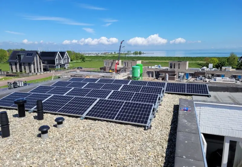 Aan de Bruine Bank in de nieuwe woonwijk Broekgouw te Volendam kregen wij een opdracht voor de plaatsing van 13 zonnepanelen op een plat dak. Door middel van schuine plaatsing op een metalen onderstel is de klant verzekerd van een hoog rendement.